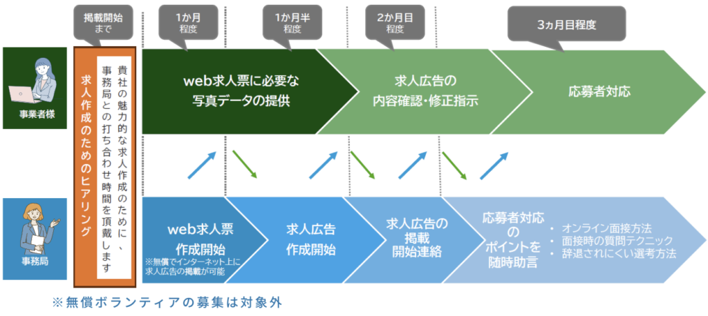本事業では、地域での活動を支える人材を確保するため、求人内容の整理から求人情報の作成、採用に向けた体制づくりまで、採用活動を一体的にサポートします。