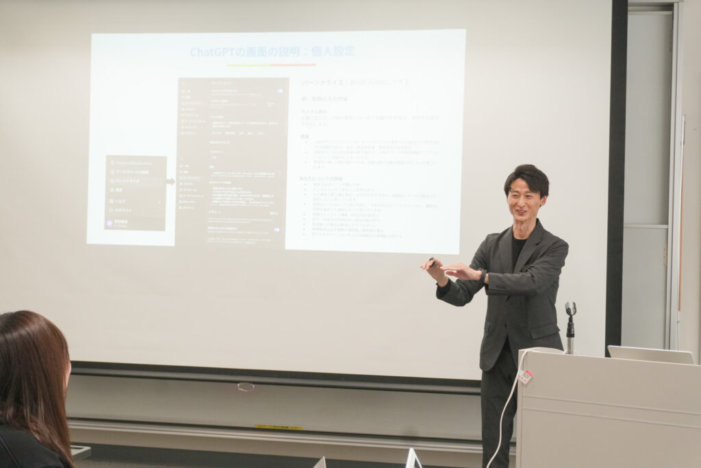 アイスブレイクの後、まずは基礎知識を共有。ChatGPTやGeminiなど主要ツールの特徴などを話し、「どのAIを、どの業務で使うと効果的か」を説明しました。続くデモでは、プロンプト(指示文)ひとつでAIの回答が劇的に変わる様子を、実際の操作画面を通して体感しました。