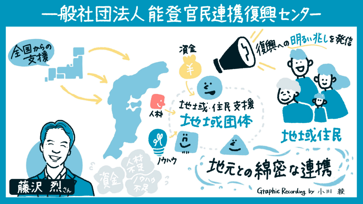 このイベントに能登官民連携復興センターのセンター長である藤沢も登壇し、センターの取り組みや成果、今後取り組むべき課題などについてお話をさせていただきました。防災チッカイギでは登壇者のプレゼンテーションの内容を画像で記録する「グラフィックレコーディング」という手法を導入しています。藤沢の登壇内容も以下のような形でまとめられておりましたのでご紹介します。